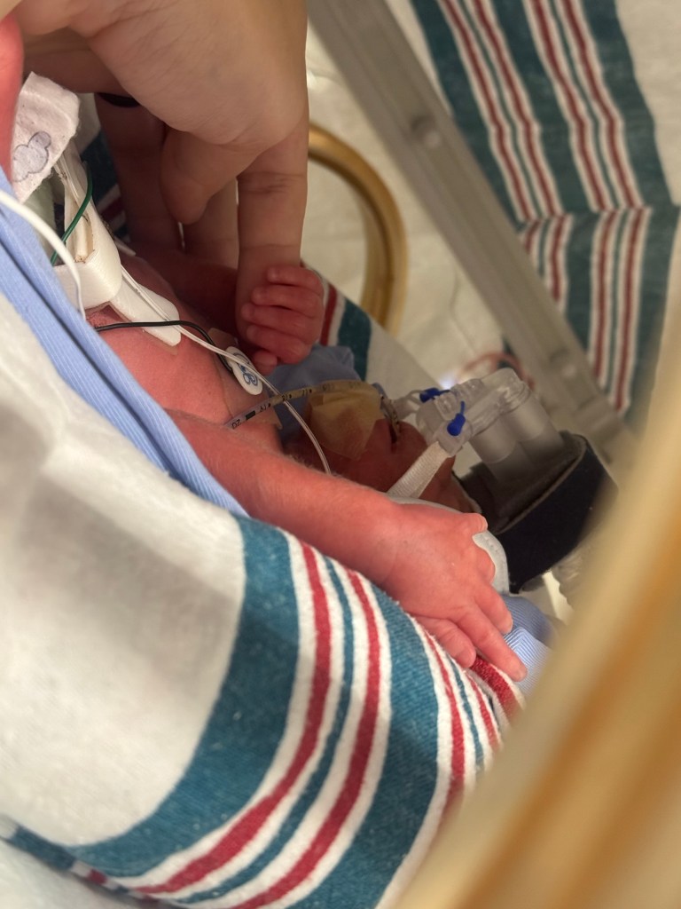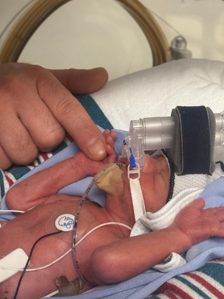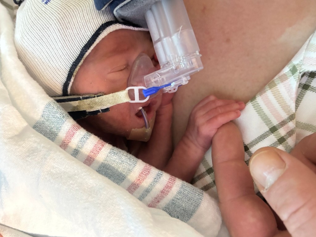 We had a really good first week in the NICU. Aiden continues to impress the doctors with his progress. We were upped to 2 holds a day! We go to the hospital every morning and evening to do his care and hold him. We hold for his feedings. The nurses say it helps with digestion to. He gets fed over 75 minutes through a feeding tube, so we hold him for his feed and then for 30 minutes afterwards as he digests. The week has been filled with a rollercoaster of emotions, we are exhausted and trying to find our way into parenthood.